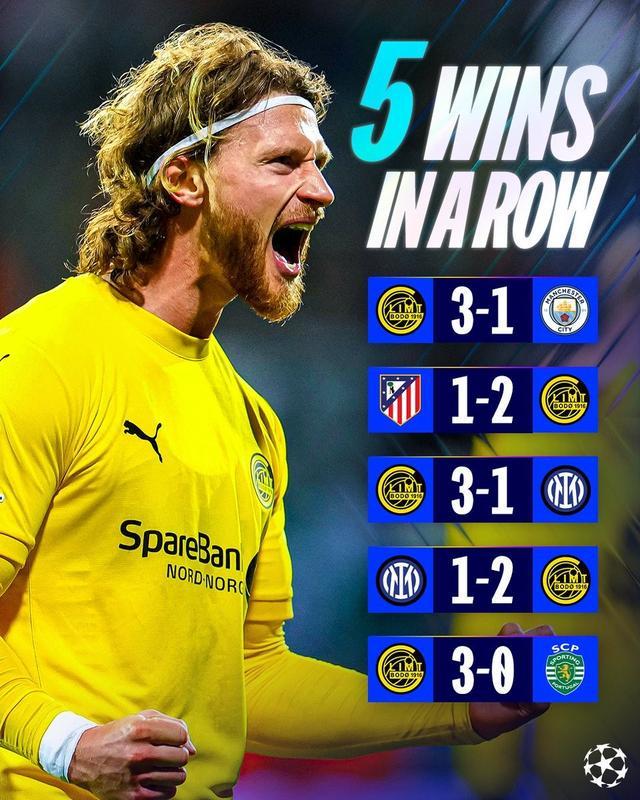 在联赛阶段最后两轮连续战胜曼城和马竞,并且在淘汰赛附加赛的比赛中双杀上赛季欧冠亚军国米之后,博德闪耀又在1/8决赛首回合的比赛中主场3-0拿下葡萄牙体育,这也让他们创纪录地达成了欧冠5连胜。